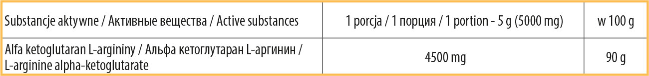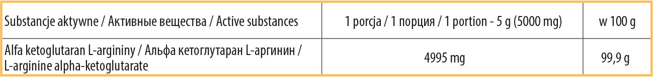 Składniki dla pomarańczowego smaku: Alfa ketoglutaran L-argininy, aromaty, regulator kwasowości: kwas cytrynowy, barwnik: beta-karoten, substancje słodzące: sukraloza, acesulfam-k.
